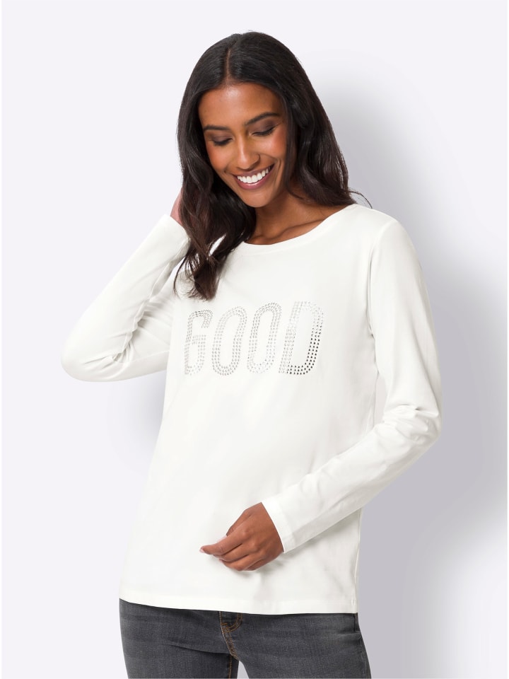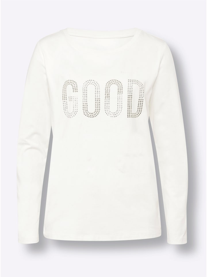 Рубашка с модной надписью «GOOD», декоративными камнями и заклепками. Круглый вырез горловины и длинные рукава. Поддерживает инициативу «Хлопок, сделанный в Африке».