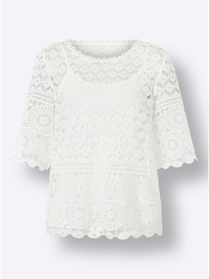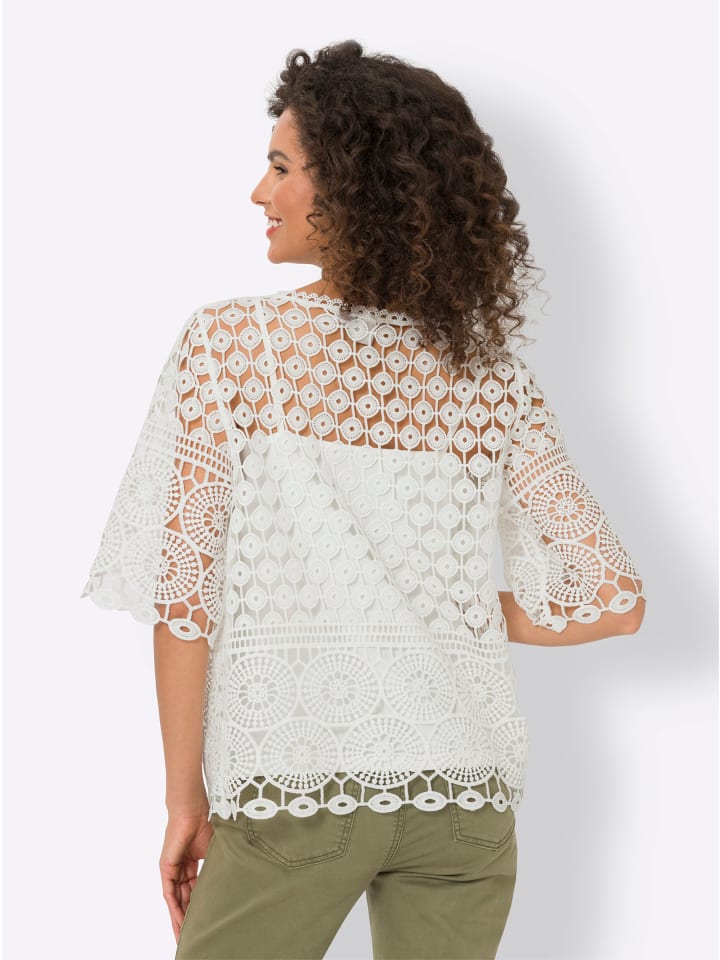 Рубашка: легкая и воздушная, привлекающая внимание, с замысловатым узором, связанным крючком. Круглый вырез горловины и рукава-трубы до середины бедра. В комплекте топ в тон.