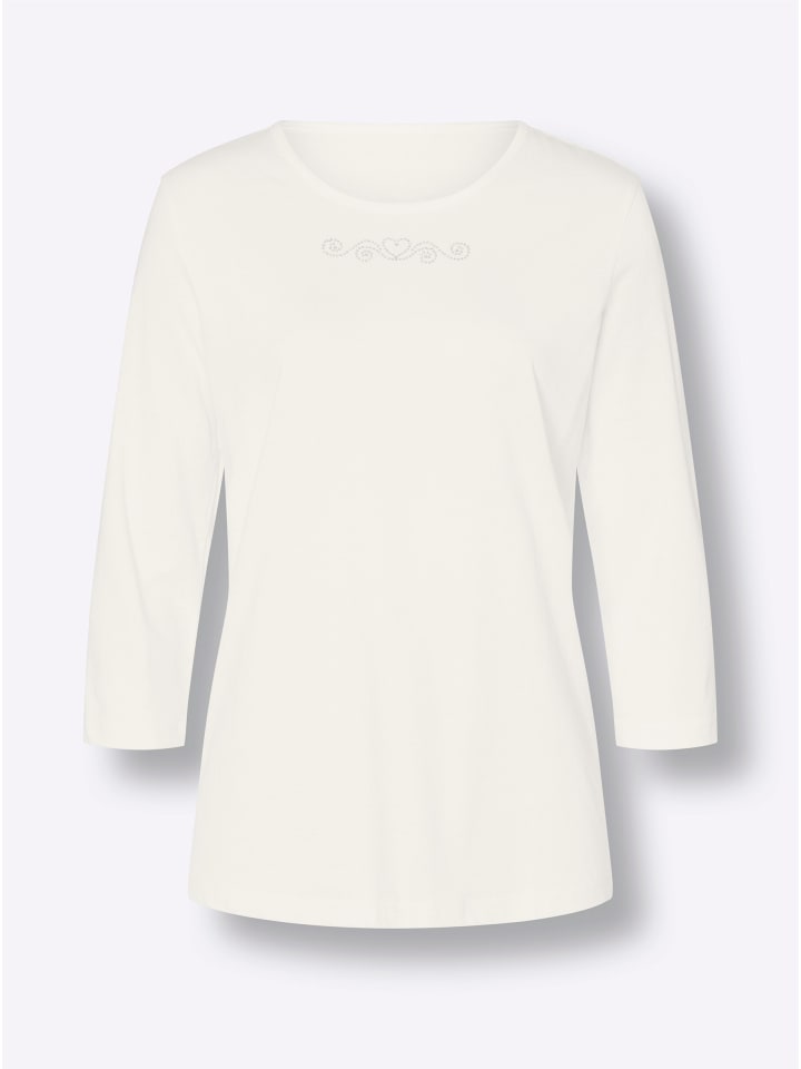 Мерцающие стразы под круглым вырезом искусно подчеркивают эту рубашку с рукавами 3/4.