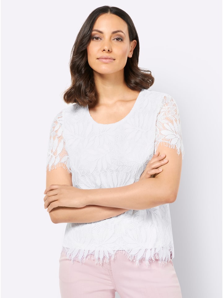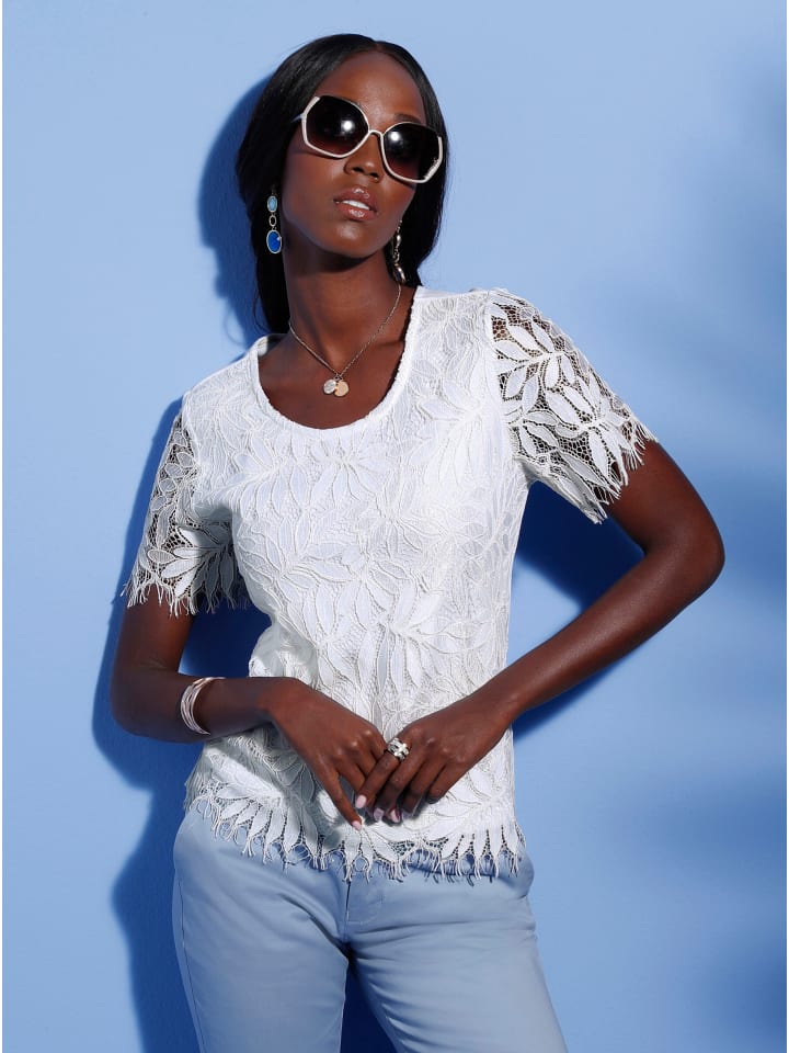 Скрытая жемчужина для модниц: эта рубашка украшена потрясающим прозрачным кружевом с листьями спереди и на рукавах. Передняя часть непрозрачна благодаря трикотажной подкладке. Рукава открывают соблазнительный вид на кожу. Спинка выполнена из гладкого трикотажа. Короткие рукава и подол имеют фестончатую отделку.