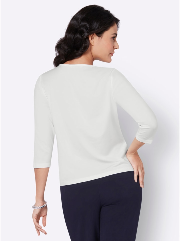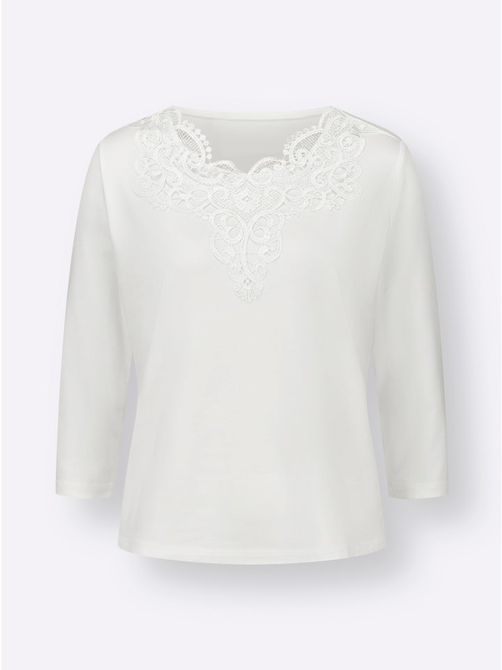 Невероятно женственная, элегантная и шелковистая - облегающая рубашка из лиоцелла с искусной кружевной вставкой на круглом вырезе, переходящем на бюст, которая непременно привлечет восхищенные взгляды. С современными рукавами три четверти.