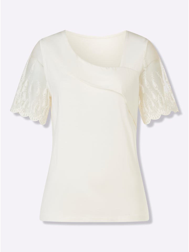 Кружевная рубашка. Изысканная модель с асимметричным вырезом и короткими кружевными рукавами.
