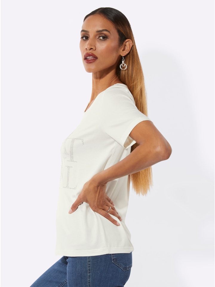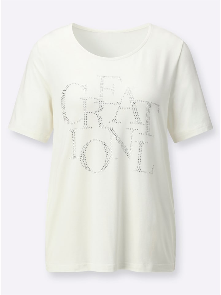 Эта рубашка из вискозы качества ECOVERO от Lenzing впечатляет своей гладкой эластичной тканью и привлекающей внимание надписью из сверкающих стразов спереди.
