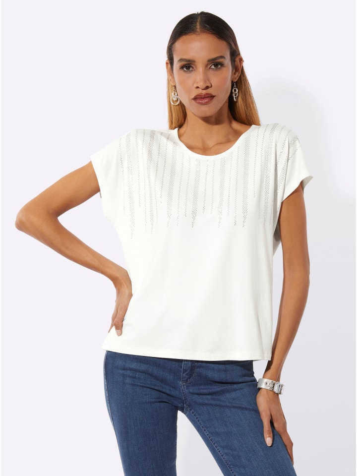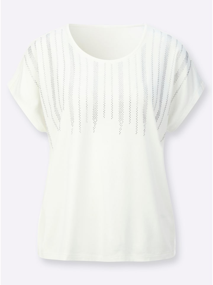 Добавит блеска любому образу: эта повседневная рубашка с круглым вырезом, стразами спереди и спущенными плечами. Изготовлена из гладкой эластичной ткани с добавлением вискозы ECOVERO от Lenzing.