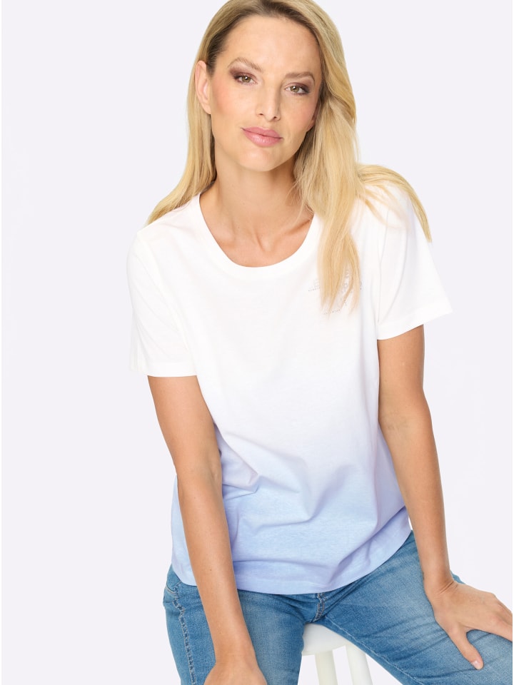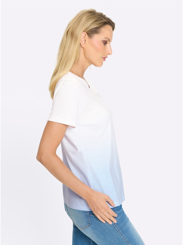 Рубашка с красивым градиентом цвета и надписью из стразов. Круглый вырез горловины и короткие рукава. Сертифицировано GOTS.