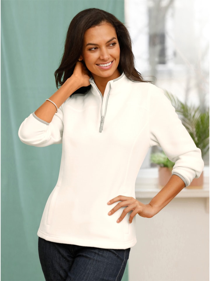 Удивительно уютная! Мягкая флисовая рубашка с воротником-стойкой, короткой молнией и рельефными швами, подчеркивающими фигуру.