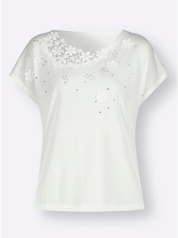 Эта рубашка просто великолепна: спереди - романтичная цветочная аппликация и сверкающие стразы. Круглый вырез и спущенные плечи.