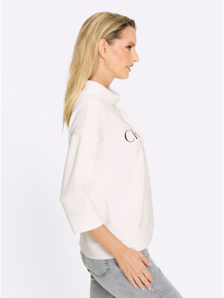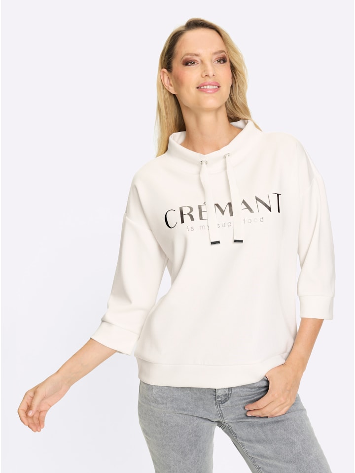 Свитшот свободного кроя с мерцающей надписью спереди. Воротник-стойка с кулиской, спущенное плечо и рукава 3/4.