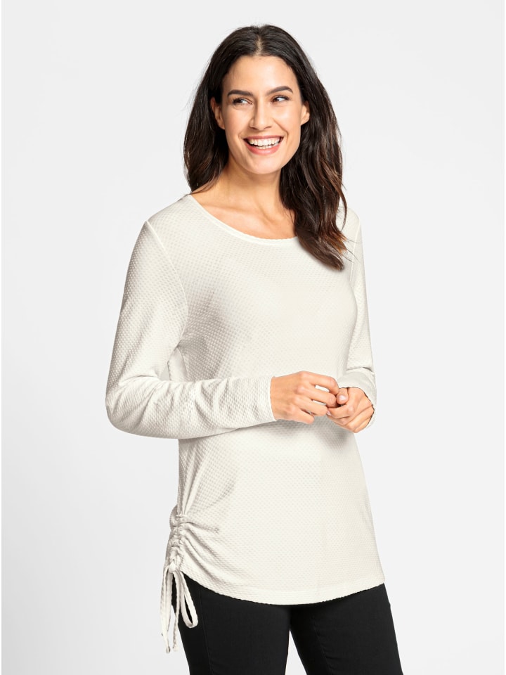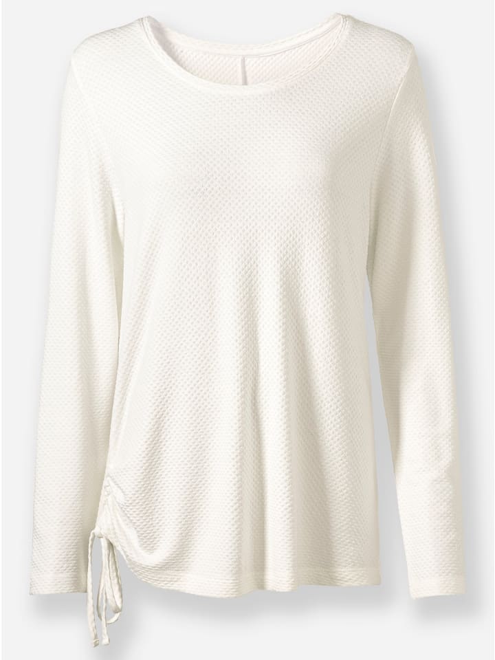 Рубашка из гладкой, струящейся вискозной жаккардовой ткани с мелкой текстурой. Благодаря двойной кулиске и завязкам на правом подоле ее можно собрать по вашему вкусу. Длинные рукава.