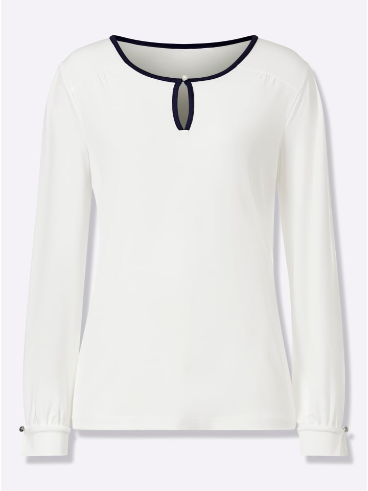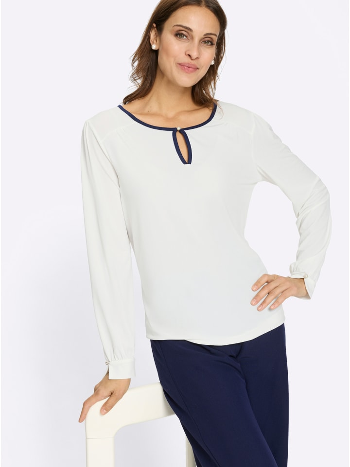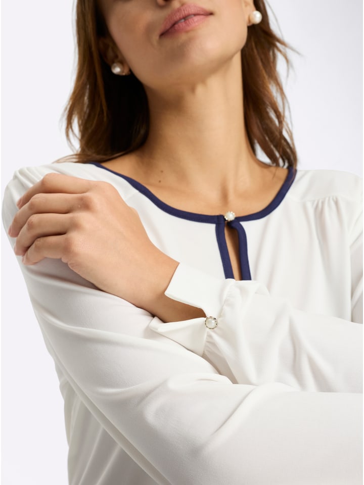 Так много внимания к деталям: футболка с круглым вырезом и контрастными акцентами. Застежка на петлю с контрастным разрезом спереди на горловине. Кокетка с эффектными сборками. Длинные рукава-фонарики с декоративными перламутровыми пуговицами на манжетах. Изготовлено из переработанного полиэстера.