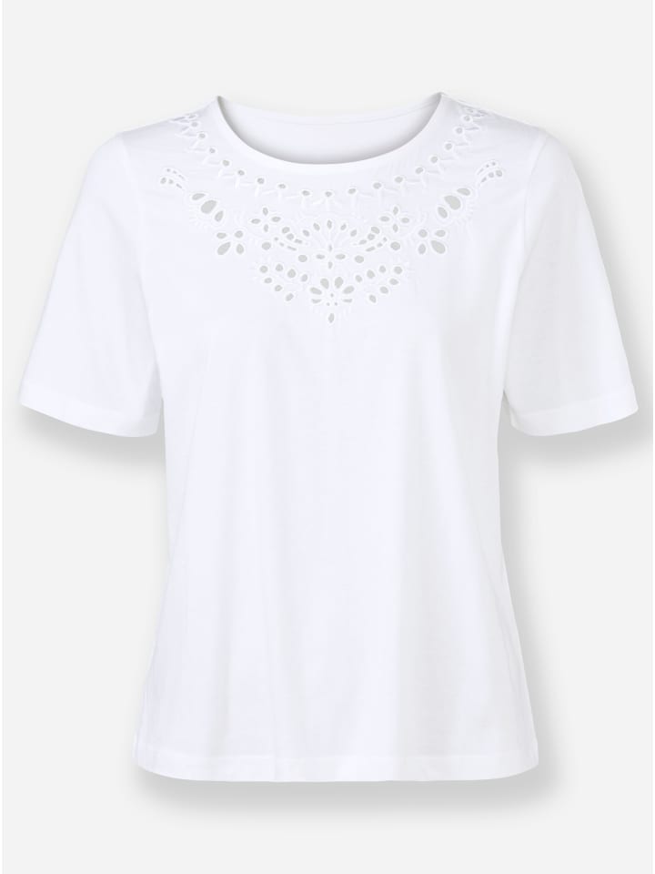 Невероятно мягкая на ощупь: рубашка из высококачественной смеси хлопка и модала. Изящная деталь: изысканная вышивка ажурными нитями на круглом вырезе. Сертифицировано OCS.