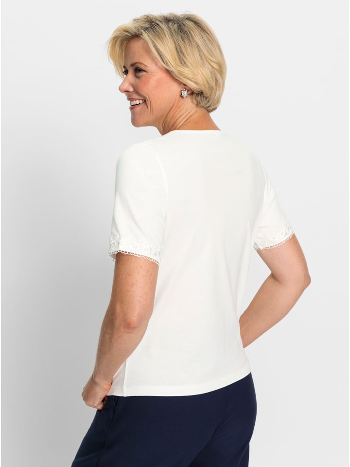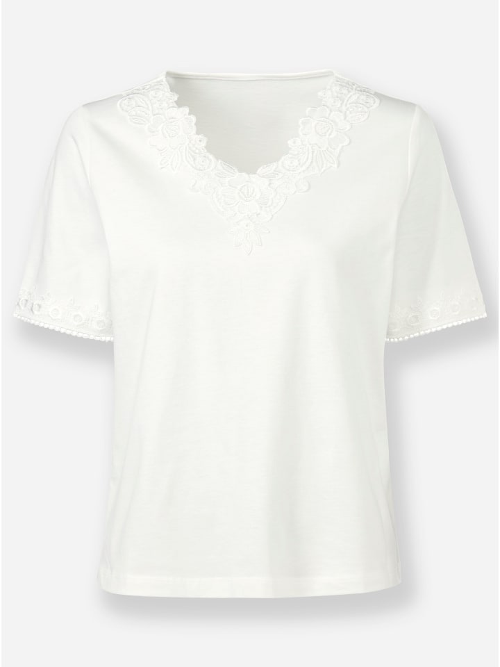 Стильная и удобная: приятная на ощупь рубашка с потрясающей кружевной отделкой на V-образном вырезе и коротких рукавах. Поддерживает инициативу «Хлопок, сделанный в Африке».