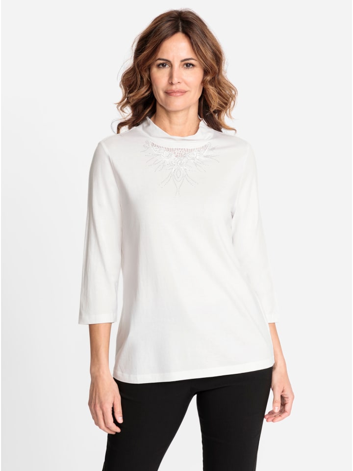 Для особых моментов: рубашка с сетчатой вставкой в тон, элегантной цветочной вышивкой и сверкающими стразами на воротнике-стойке. Изготовлена из органического хлопка, не требующего особого ухода. Рукава 3/4. Изделие сертифицировано OCS.