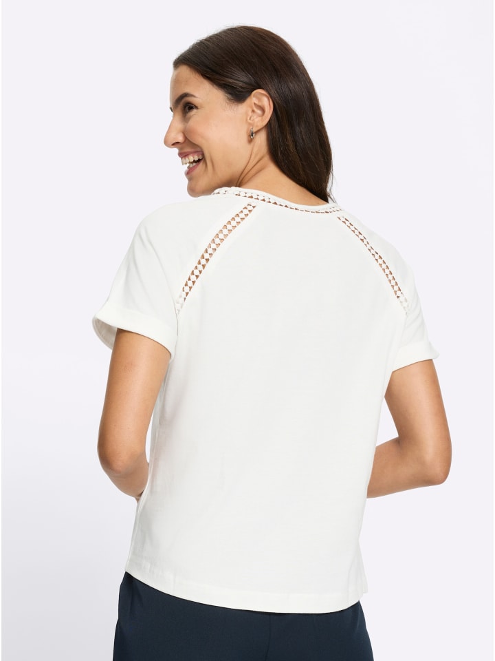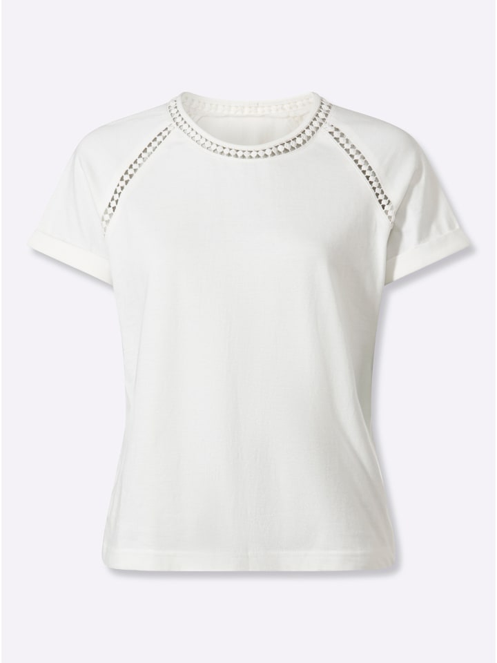 Этот топ с круглым вырезом излучает летнюю легкость благодаря нежной кружевной отделке по вырезу и низу рукавов реглан с пришитыми манжетами. Слегка закругленный низ. Сертифицировано GOTS, изготовлено из органического хлопка.