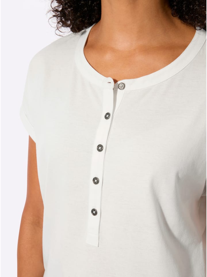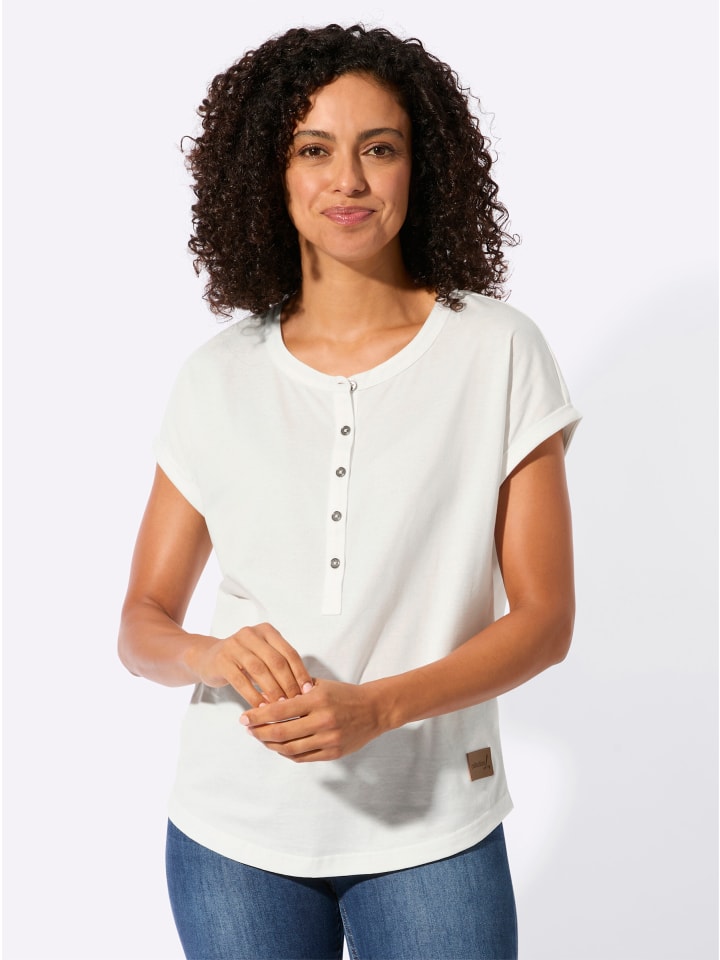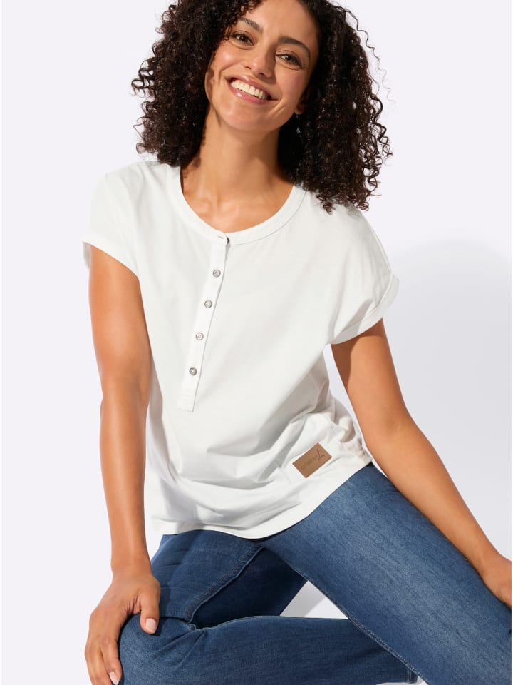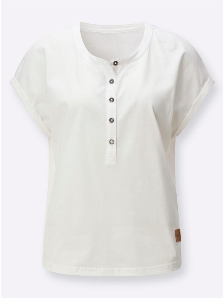 Простая, мягкая и просто красивая: футболка с круглым вырезом и короткой планкой на пуговицах. Небрежно спущенные плечи с пришитыми манжетами рукавов. Низ слегка закруглен. Сертификация GOTS.
