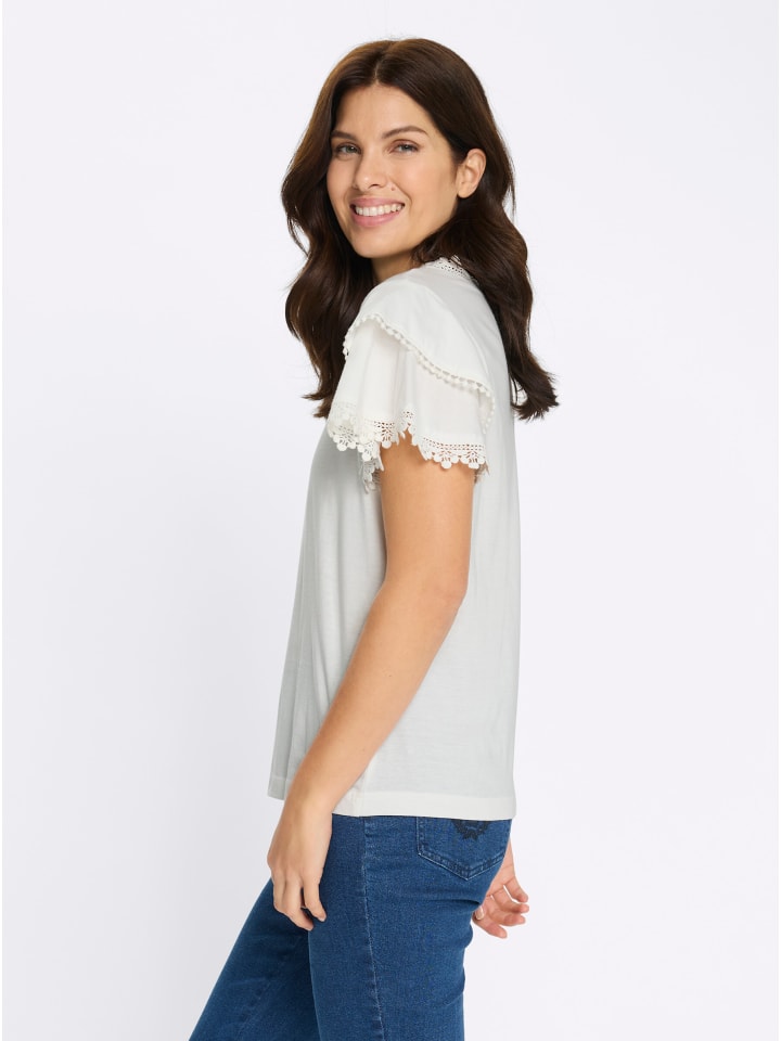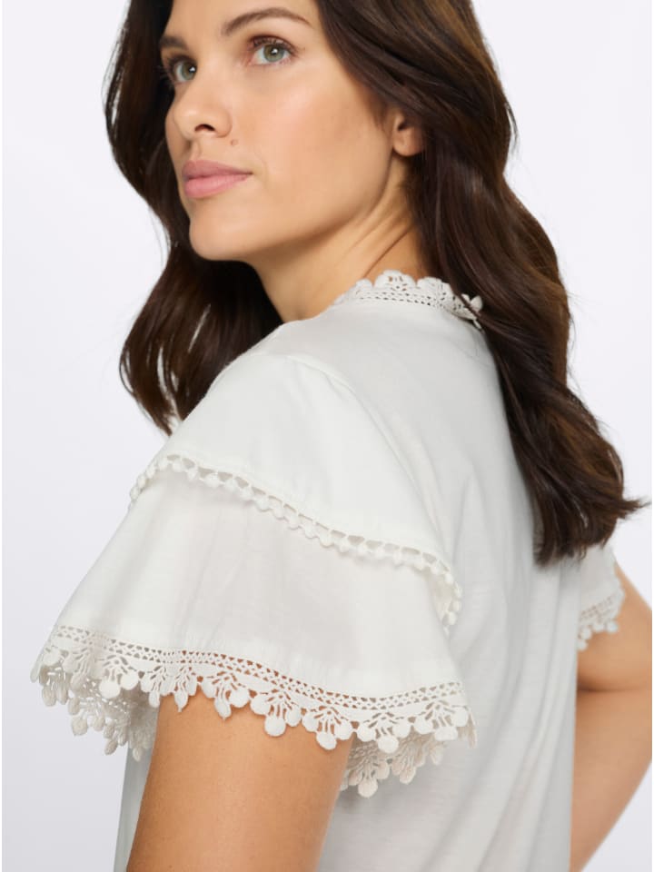 Эта рубашка с короткими рукавами просто восхитительна. Нежное кружево на двойных рукавах-крылышках и V-образном вырезе привлекает внимание.