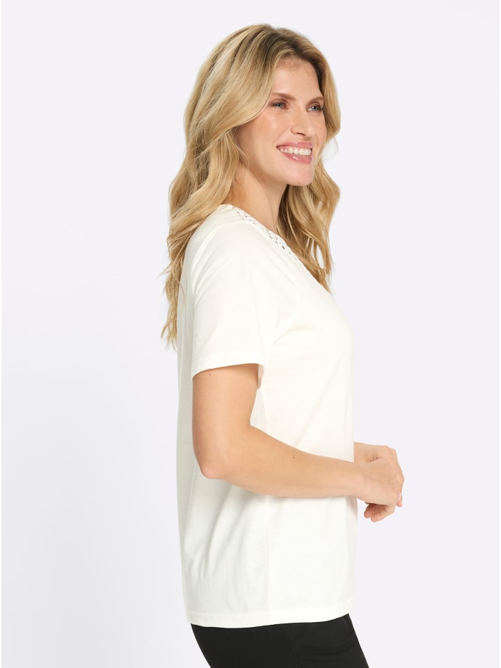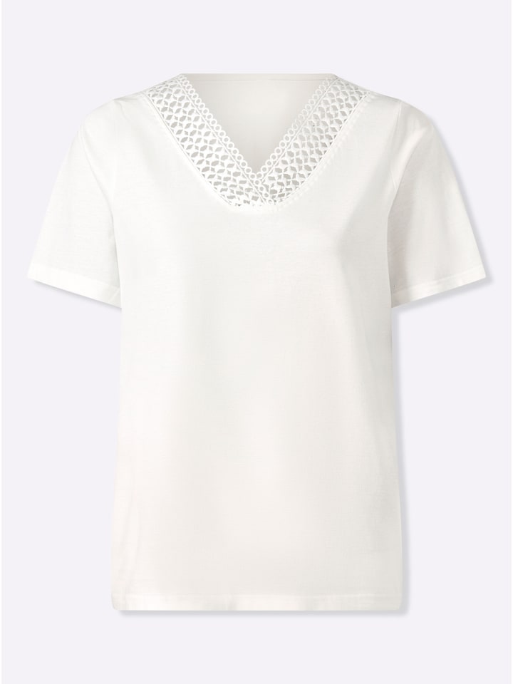 Просто очаровательно. Приятная на ощупь рубашка с короткими рукавами и декоративной отделкой широким кружевом вдоль V-образного выреза.