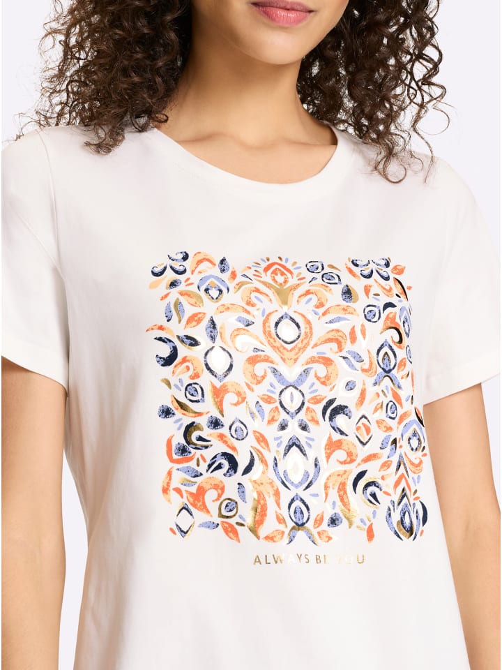 Модная футболка с принтом и стратегически расположенным принтом металлической фольги спереди. Прямой крой, круглый вырез горловины и короткие рукава. Сертифицировано GOTS.