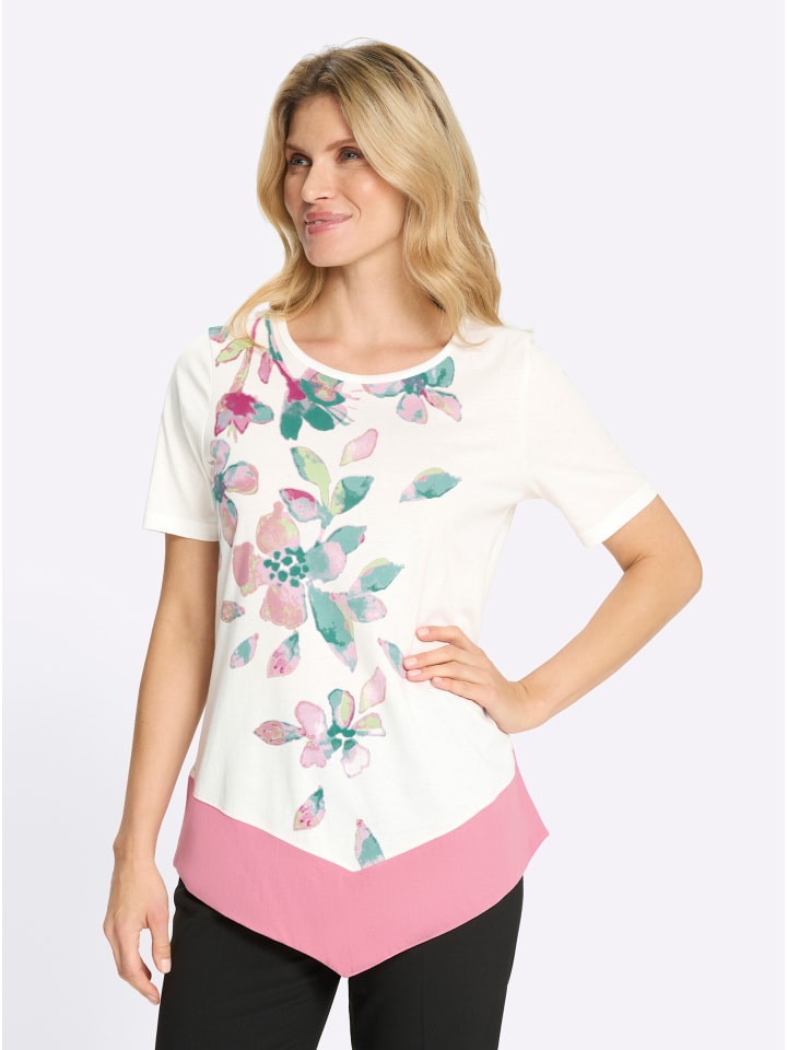 Туника с цветочным узором, подчеркивающая фигуру, с круглым вырезом и короткими рукавами. Удобный А-образный крой с удлиненным подолом, сужающимся к заострению спереди.