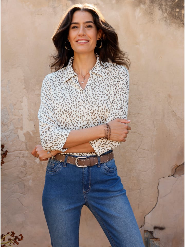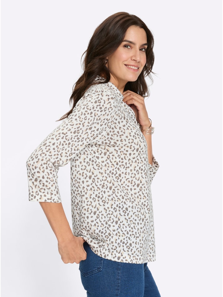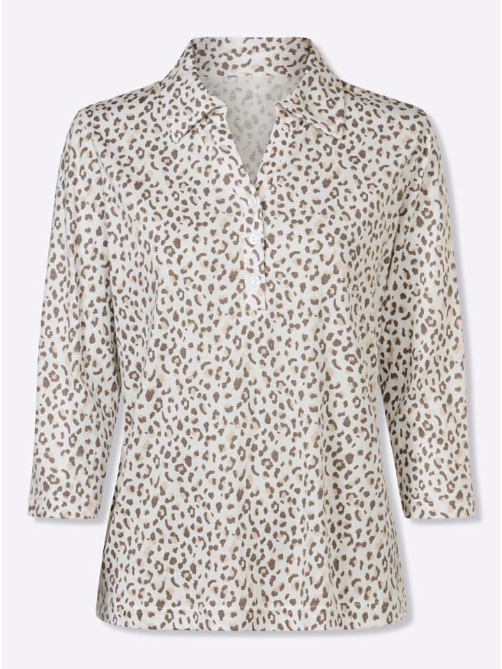 Удобная рубашка-поло с современным анималистичным принтом! Воротник-поло, открытый V-образный вырез, короткая планка с мерцающими пуговицами и рукава 3/4. Сертифицировано OCS.
