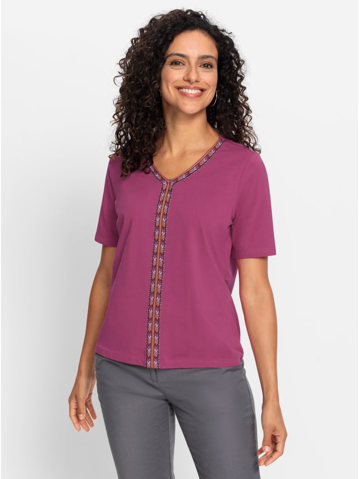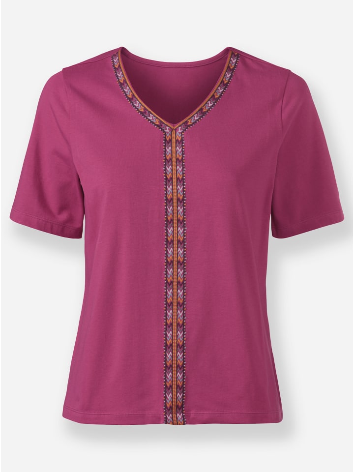 Эта рубашка с V-образным вырезом привлекает внимание вышивкой по вырезу и спереди. Короткие рукава. Сертифицировано GOTS.