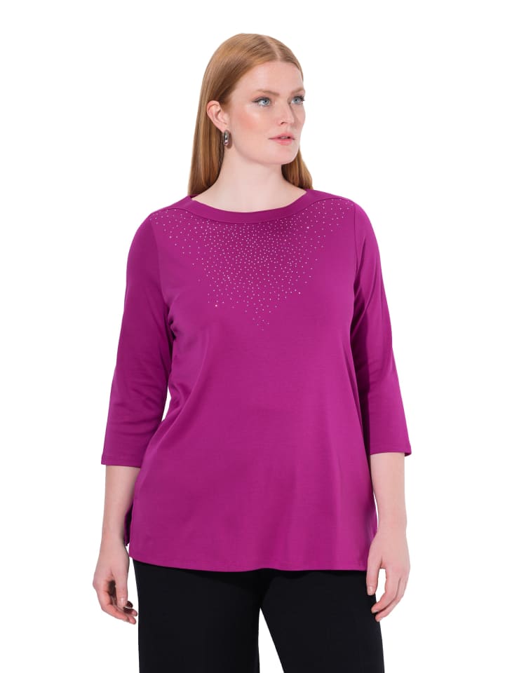 Футболка А-силуэта из высококачественного мягкого хлопкового трикотажа с декоративными стразами на вырезе-лодочке. Рукава три четверти. Боковые разрезы для мягкого драпирования и дополнительного комфорта.