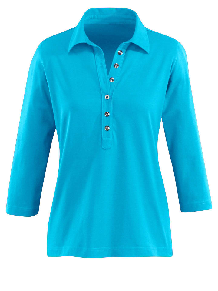 Мягкая качественная рубашка поло. Модная длинная планка с серебристыми пуговицами. Рукава 3/4. Продукт сертифицирован OCS.