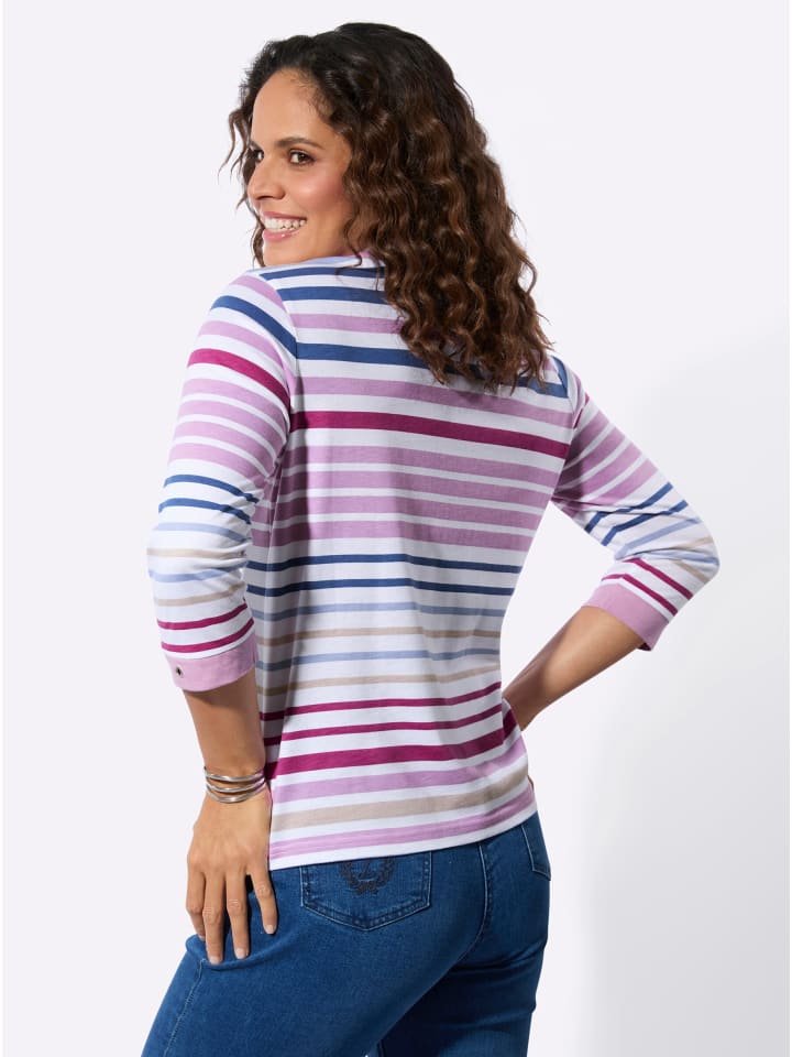 Эта спортивная классика представлена здесь в прекрасном красочном виде! Рубашка-поло с привлекательным полосатым рисунком и отделкой люверсами на горловине. Рукава 3/4 с контрастными манжетами и декоративными люверсами.