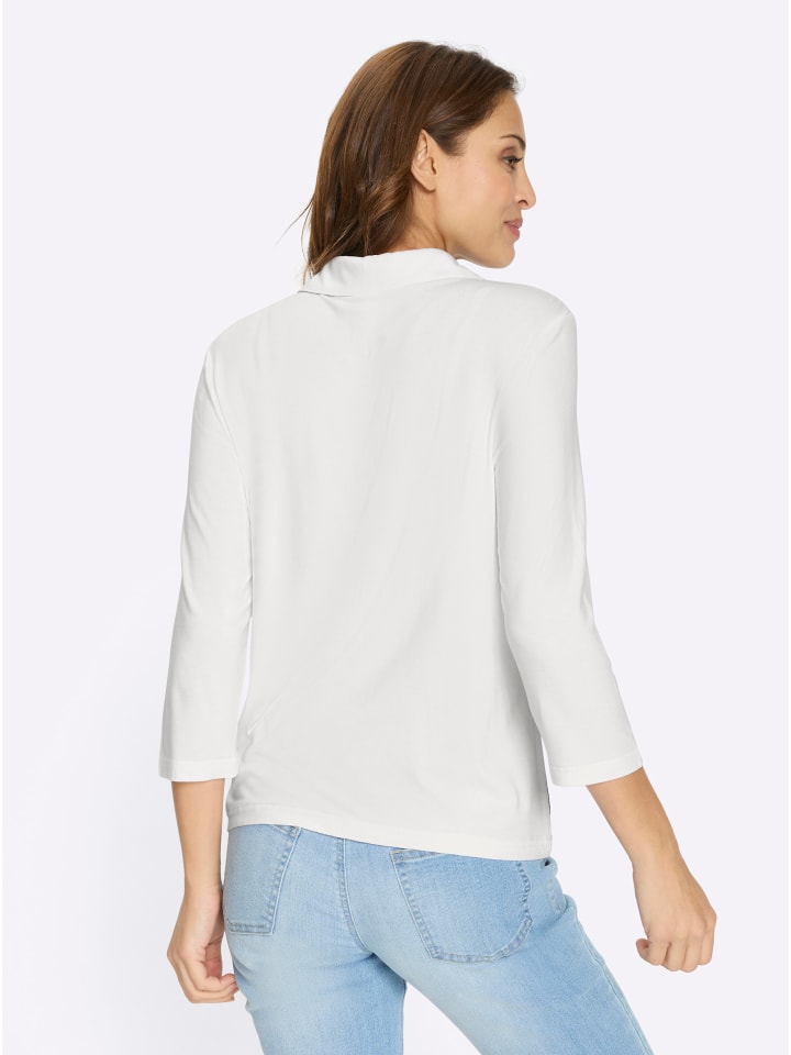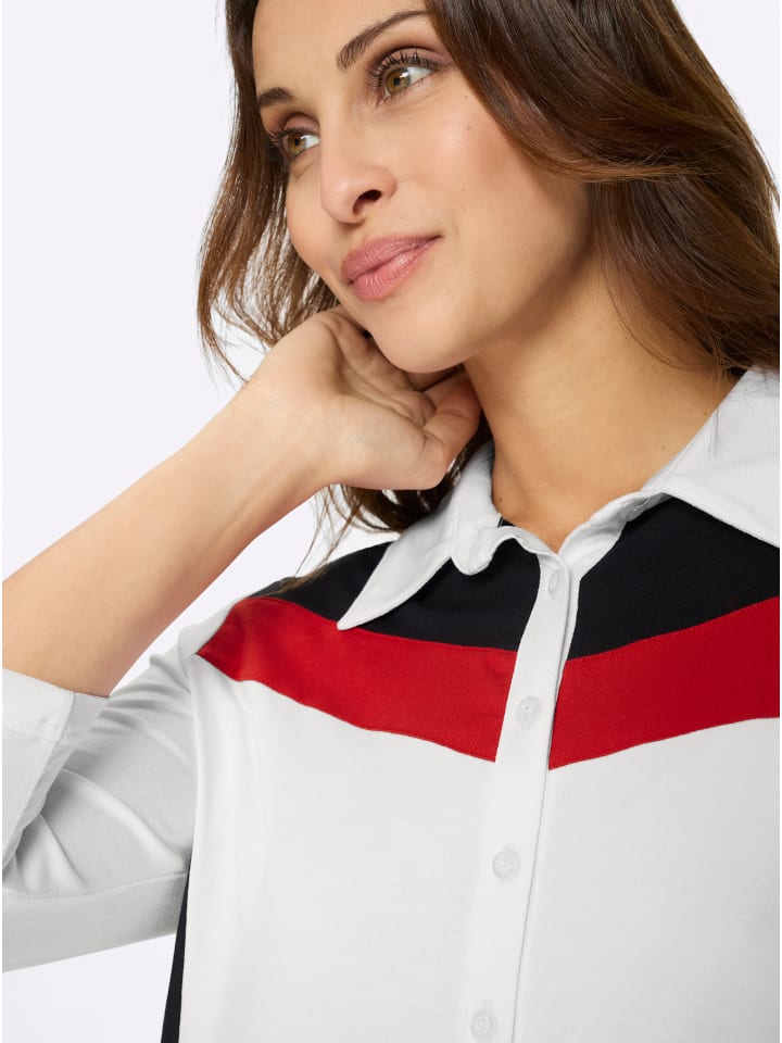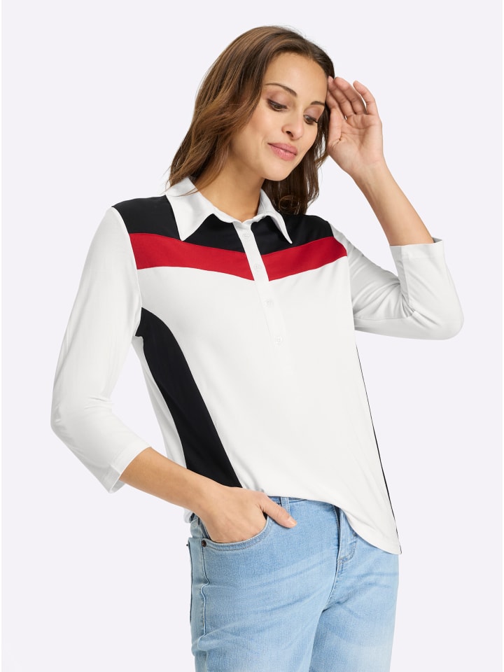Классическая рубашка-поло в современном исполнении. Контрастные вставки на плечах и по бокам добавляют нотку изысканности и визуально стройнят силуэт. Рубашечное воротничок, короткая планка на пуговицах и рукава три четверти. Изготовлена из вискозы Lenzing ECOVERO.