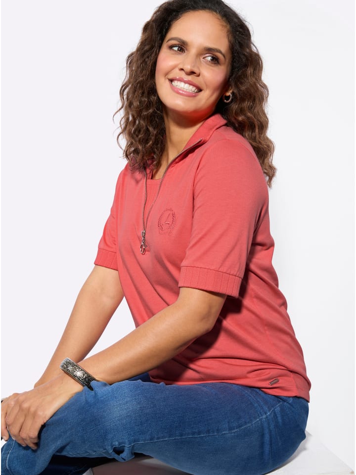 Небольшая вставка на ребристом воротнике с декоративной молнией создает изысканный образ «2 в 1». Удобная рубашка-поло с вышивкой Collection L в тон цвета на груди и ребристыми манжетами на коротких рукавах. Одинарный джерси. Поддерживает инициативу «Сделано в Африке» (Collection Made in Africa).