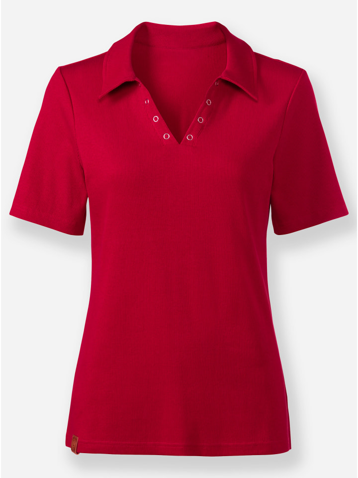 У каждого должна быть в гардеробе такая вещь: ребристая рубашка-поло с открытым воротником, V-образным вырезом с люверсами и короткими рукавами. Поддерживает инициативу «Хлопок, сделанный в Африке».