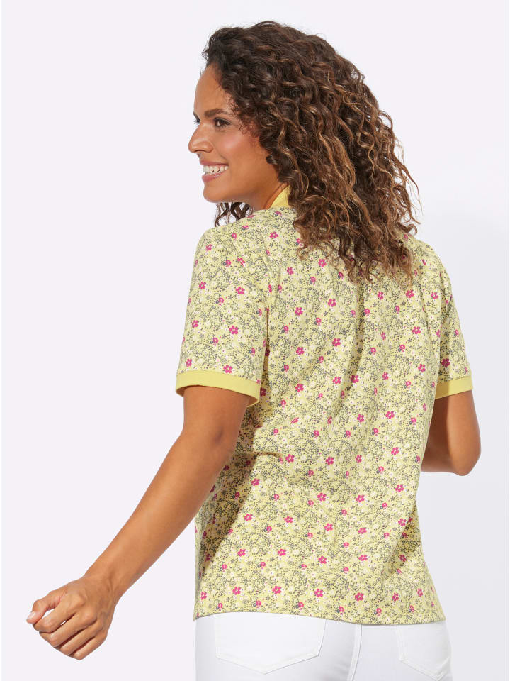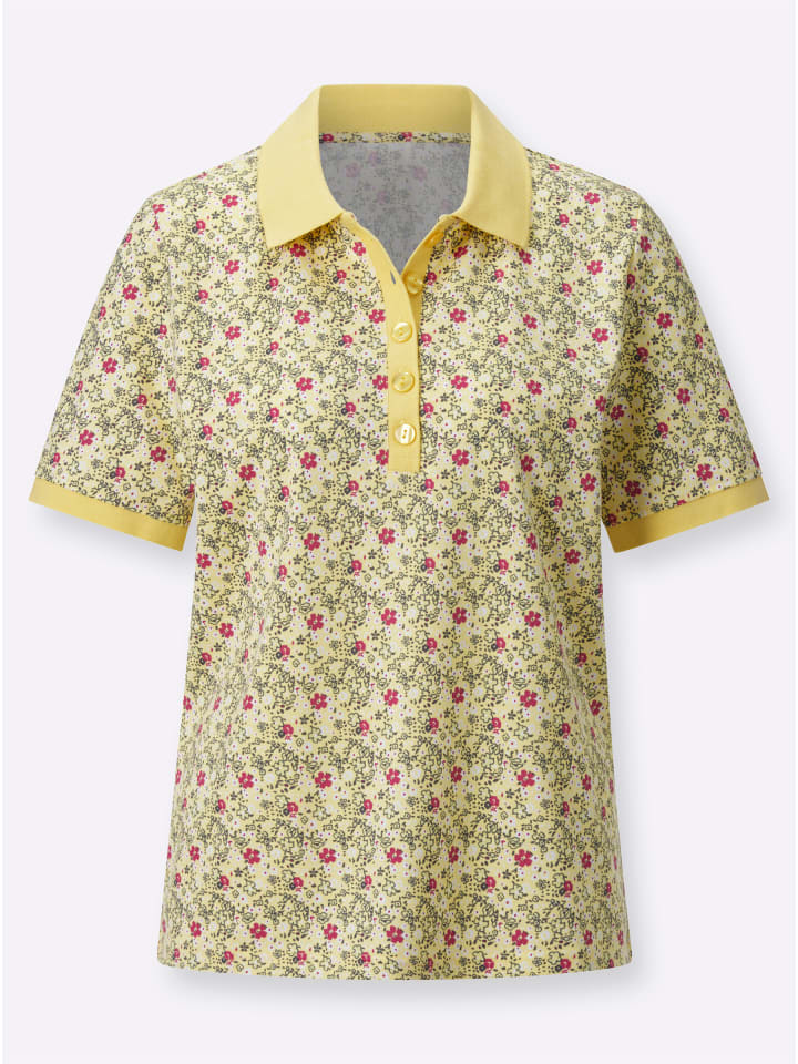 Рубашка-поло с цветочным принтом, воротником-стойкой, планкой на пуговицах и контрастными манжетами. Комфортная однотонная трикотажная ткань из чистого хлопка. Поддерживает инициативу «Хлопок, сделанный в Африке».