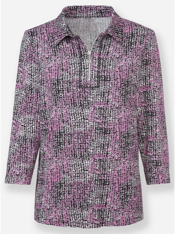 Фантастически принтованная рубашка-поло со стразами на воротнике и молнии. Рукава три четверти с разрезами. Изготовлена из очень приятной для кожи ткани.