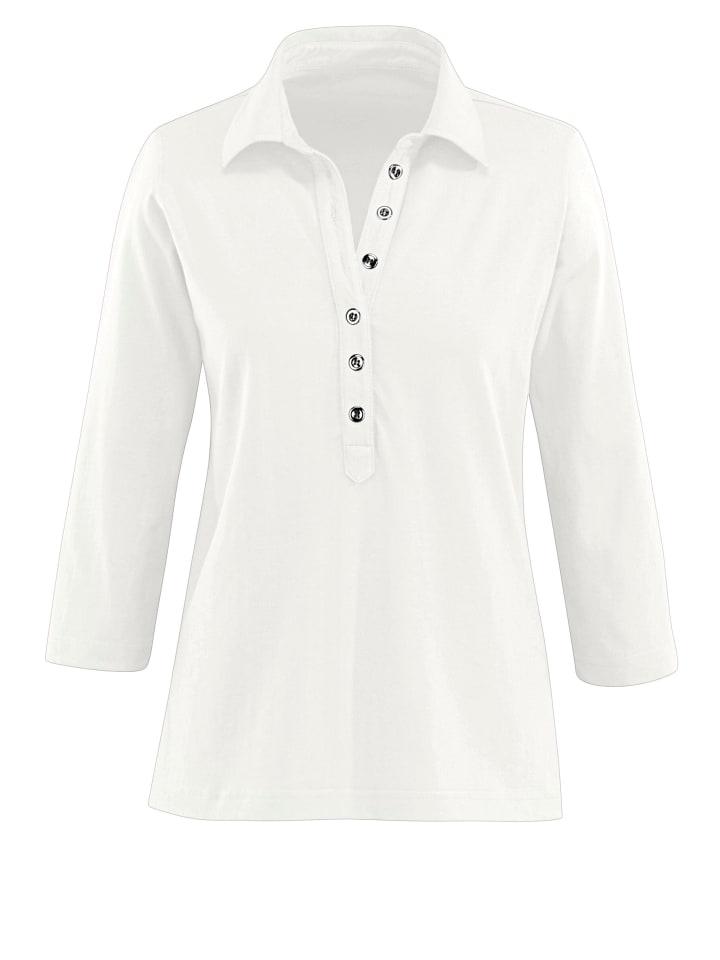 Мягкая качественная рубашка поло. Модная длинная планка с серебристыми пуговицами. Рукава 3/4. Продукт сертифицирован OCS.