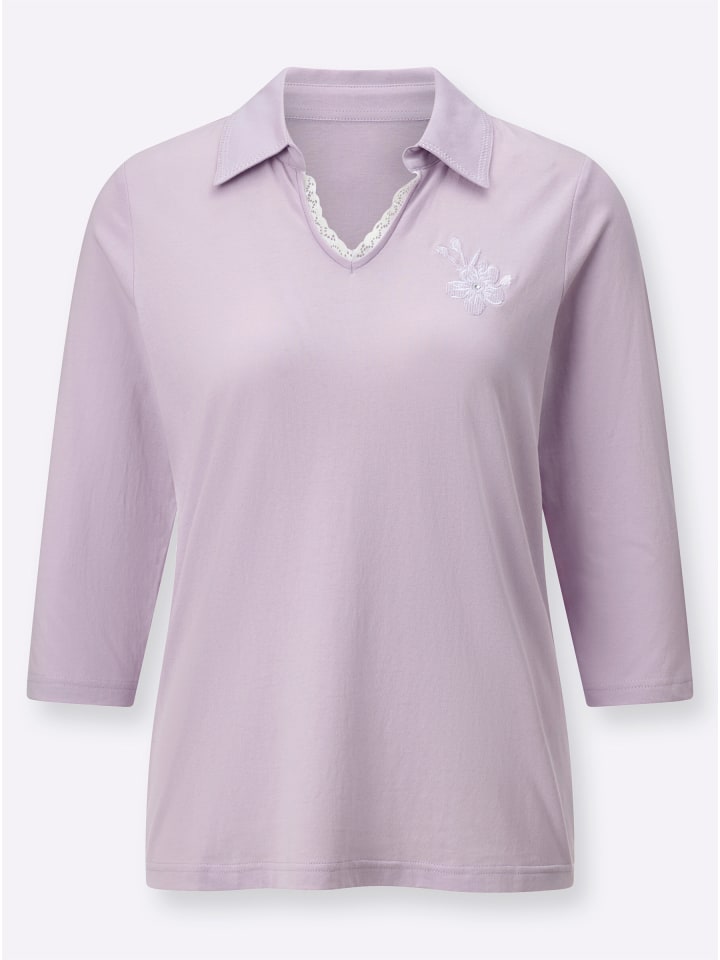 Изящно сшитая рубашка-поло с декоративным кружевом на горловине. Цветочная вышивка и отделка стразами. Открытый V-образный вырез. Рукава 3/4. Сертифицировано GOTS.