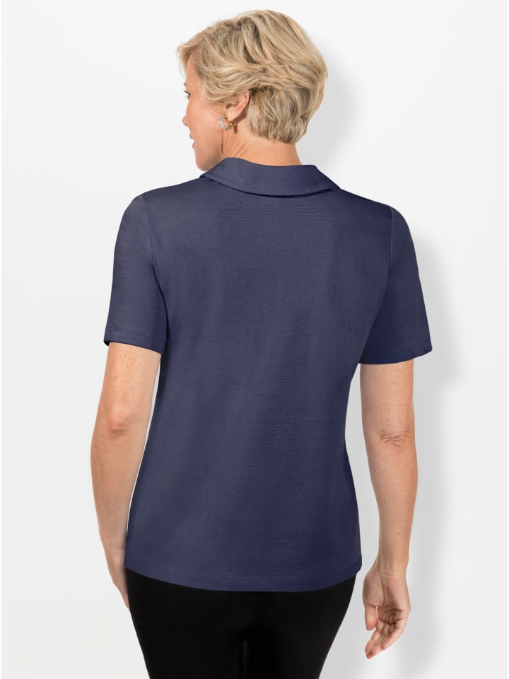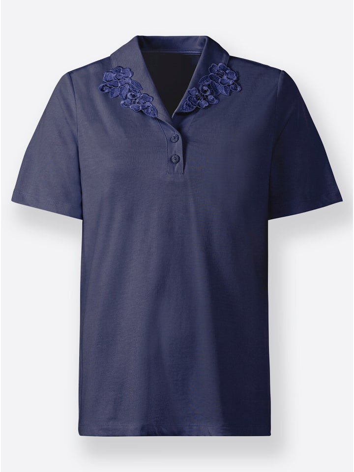 Слегка мерцающая снаружи, мягкий хлопок внутри. Рубашка-поло с элегантной кружевной отделкой и стразами на воротнике. Короткая планка с двумя пуговицами. Короткие рукава. Поддерживает инициативу «Сделано в Африке» (Cat. Made in Africa).