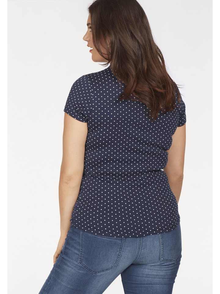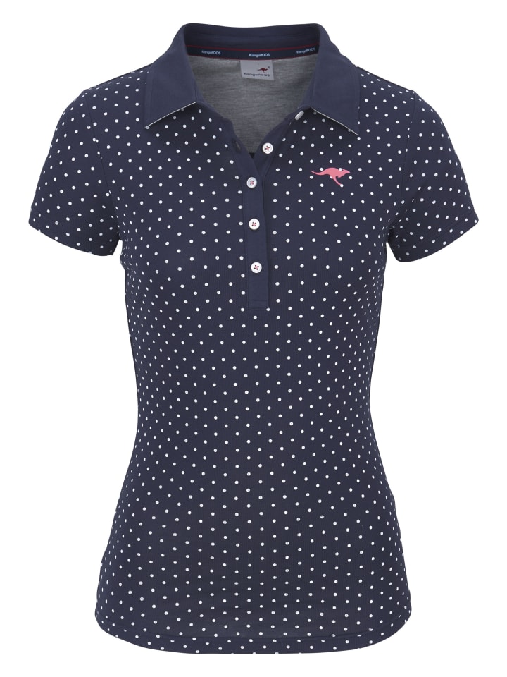 Удобная женская рубашка-поло KangaROOS с рисунком в горошек. Длина до бедер, приталенный крой, короткие рукава. Застежка на пуговицы. Изготовлена из эластичного и мягкого трикотажа, обеспечивающего исключительный комфорт.
