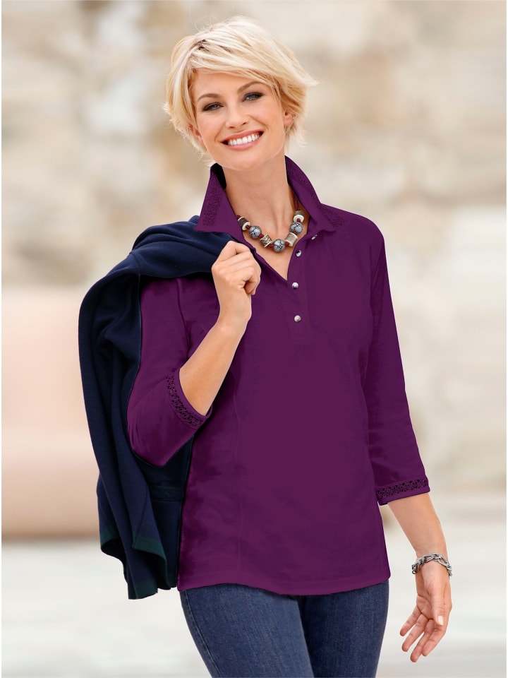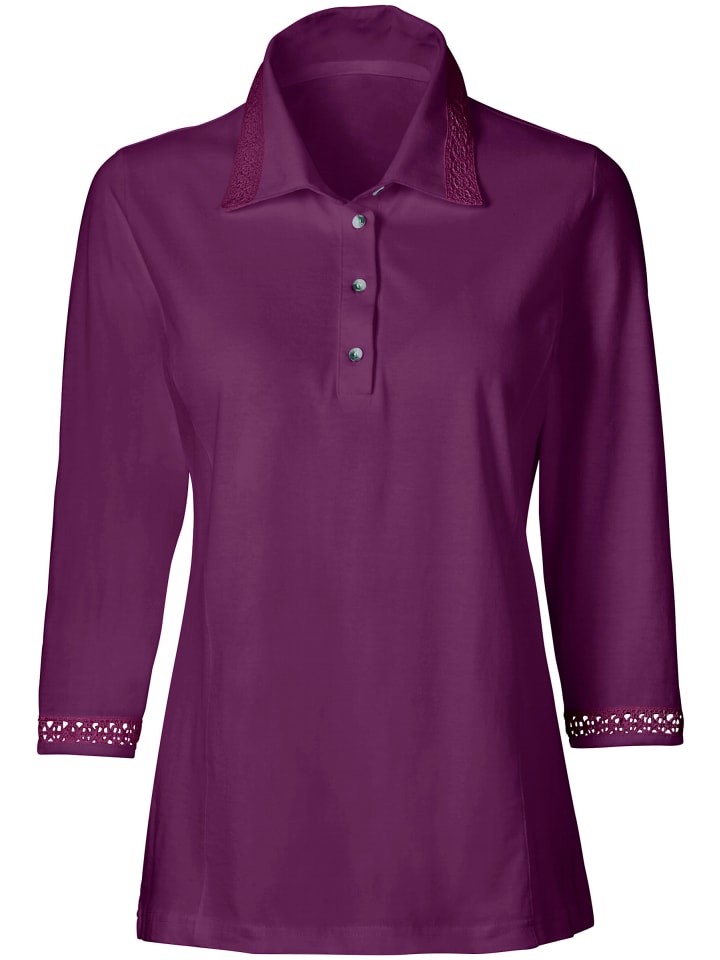 Эта рубашка выглядит очень изысканно благодаря отделке кружевом крючком на воротнике-поло и манжетах рукавов. Рукава три четверти, планка с привлекательными пуговицами с роговым эффектом и рельефные швы обеспечивают идеальную посадку. Ткань невероятно мягкая.
