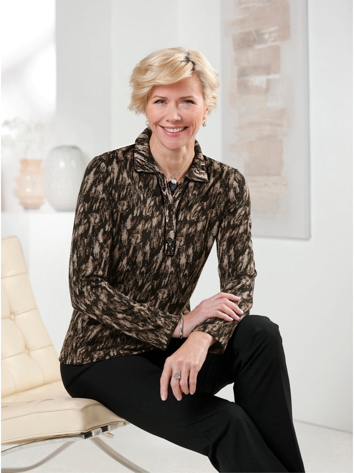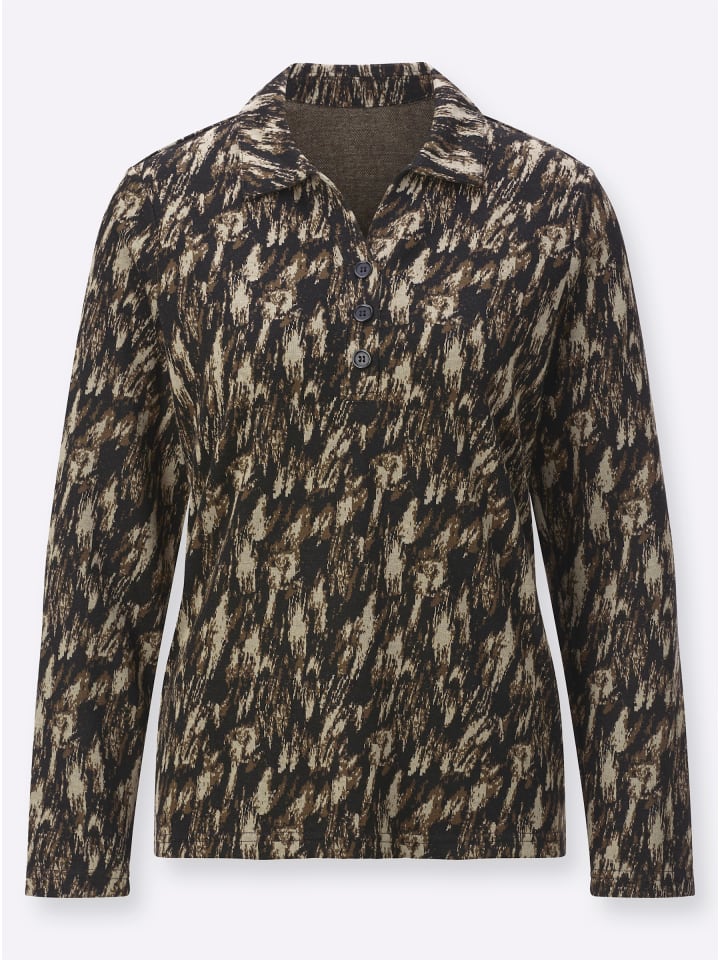 Рубашка-поло с графическим рисунком из высококачественного жаккардового трикотажа. V-образный вырез с имитацией планки с пуговицами. Длинные рукава.