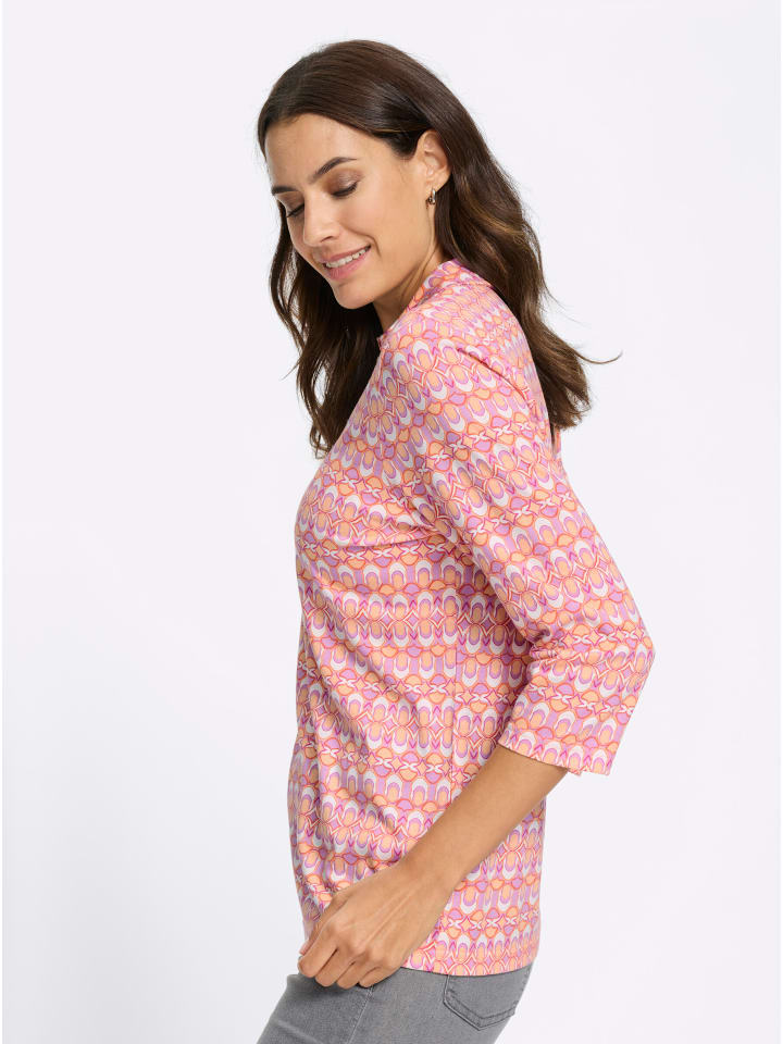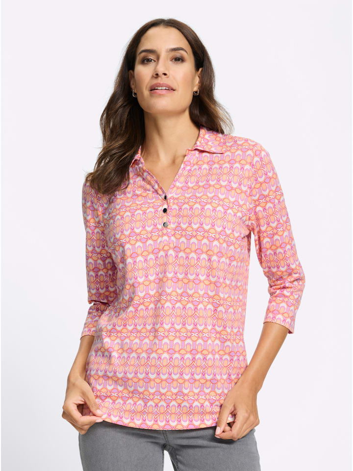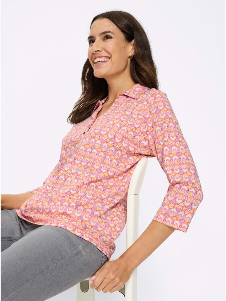 Эта рубашка-поло с ярким принтом напоминает о стиле семидесятых, который сейчас переживает возрождение. Рубашка имеет рубашечный воротник, открытый V-образный вырез и короткую планку с блестящими серебряными пуговицами. Популярные рукава три четверти. Сертифицировано OCS, изготовлено из органического хлопка.
