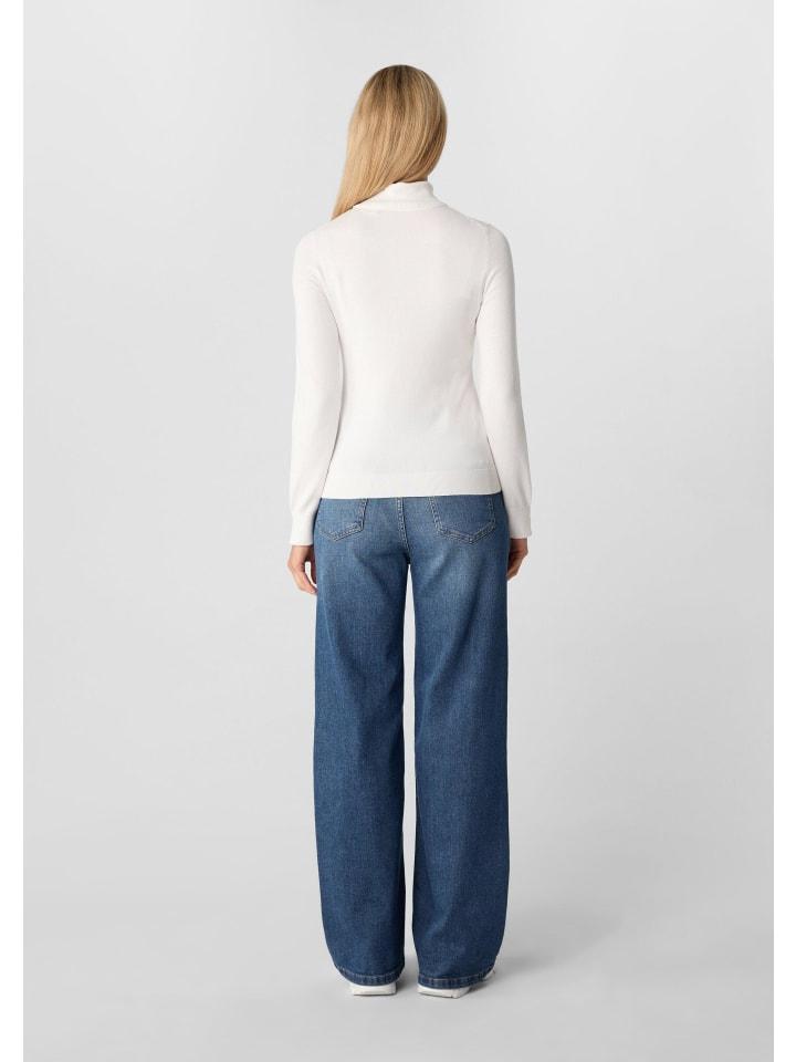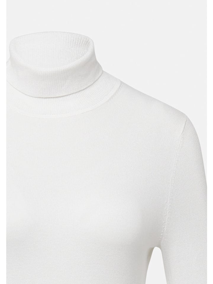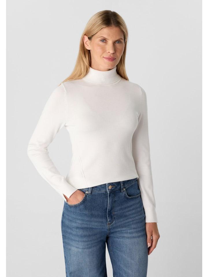 Изящный облегающий свитер с высоким воротом: этот свитер из тонкой вискозной смесовой пряжи элегантно облегает фигуру. Мягкая, эластичная текстура обеспечивает исключительный комфорт. Стильные разрезы на рукавах и ребристые манжеты добавляют модные акценты. Декоративная деталь по подолу придает изделию эксклюзивный вид. Идеально подходит для деловых образов или в качестве стильного многослойного элемента для прохладных вечеров.