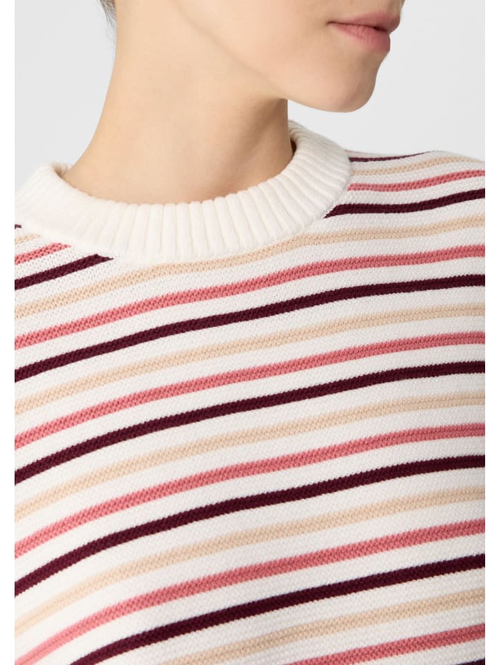 Полосатый шик и комфорт: этот свободный трикотажный свитер сочетает в себе повседневный стиль и женственную элегантность. Рукава 3/4 и круглый вырез с ребристой отделкой добавляют модные акценты. Благодаря эластичному трикотажу он удобно облегает фигуру. Сочетайте его с джинсами или носите с брюками для создания лаконичного образа - универсального и всегда актуального.