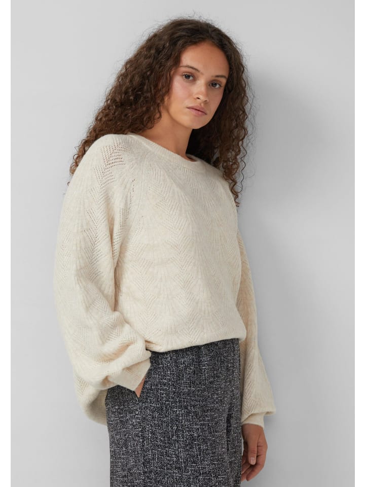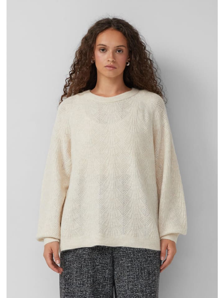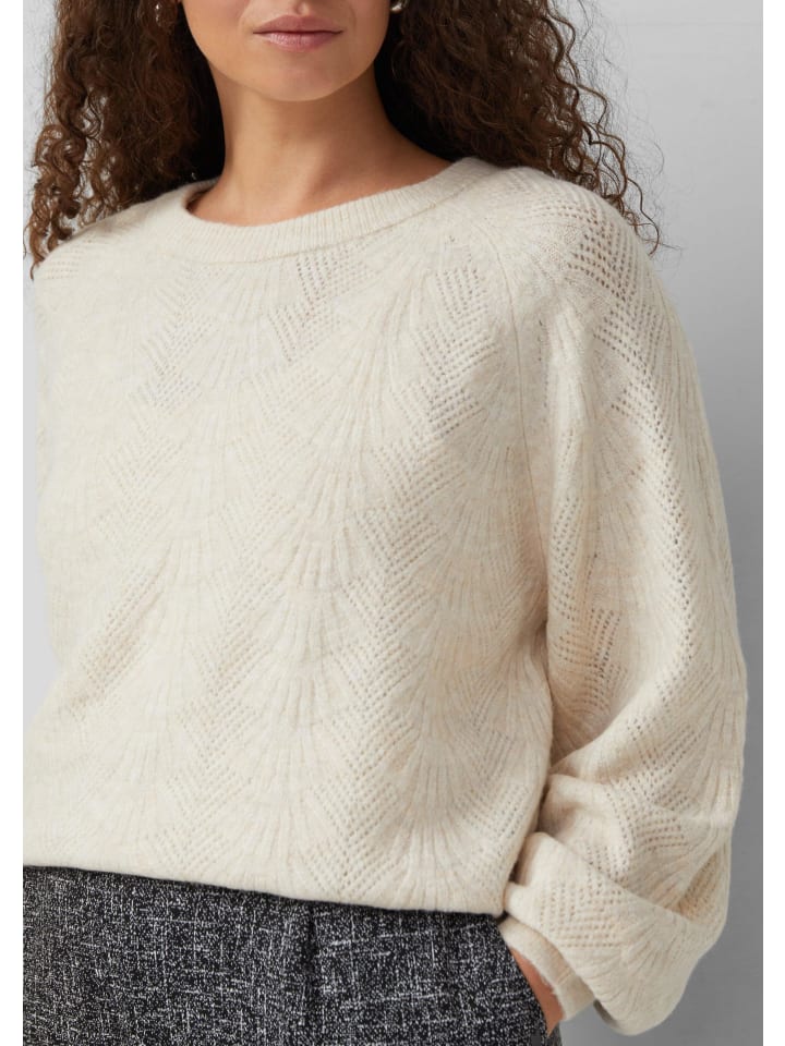 Свободный стиль на весь день: этот вязаный свитер с изысканным ажурным узором и рукавами реглан впечатляет своим классическим кроем. Ребристые манжеты обеспечивают идеальную посадку как для отдыха, так и для выхода в свет.
