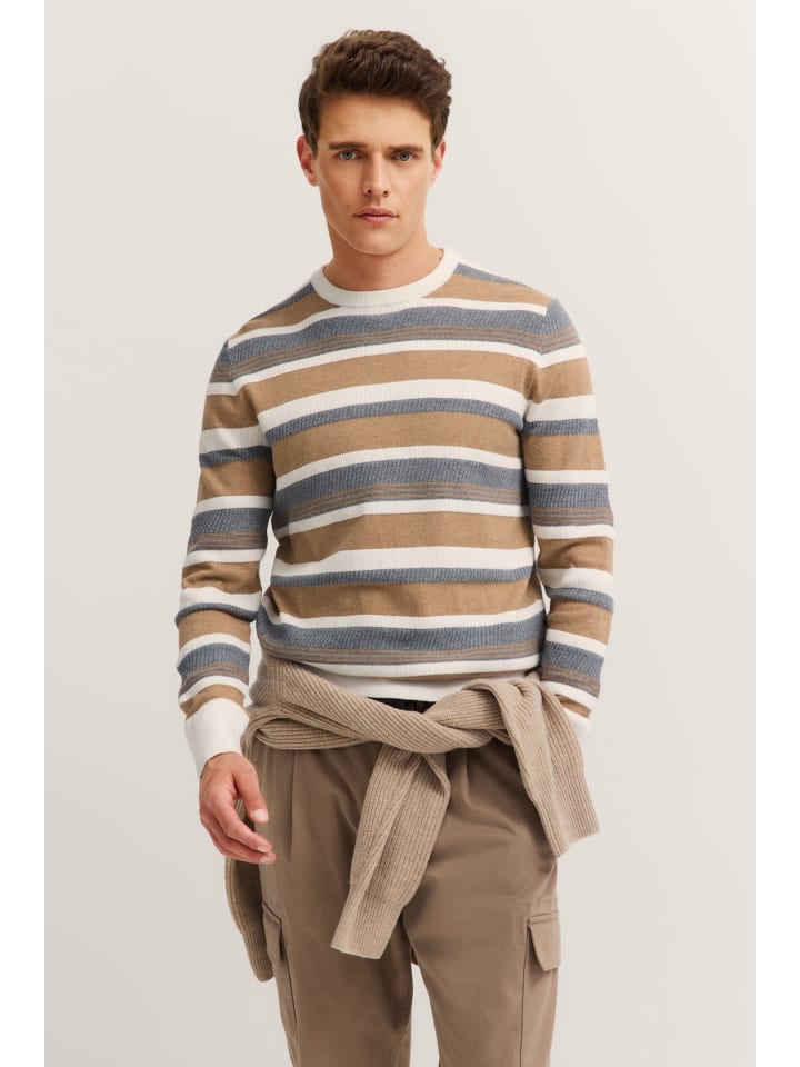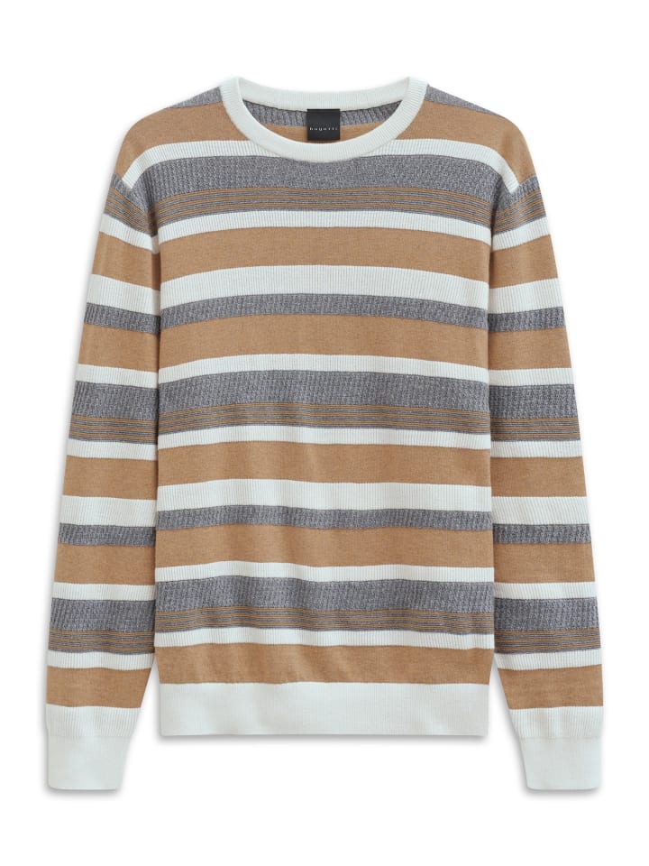 Этот полосатый свитер от Bugatti добавит свежую нотку в ваш гардероб, сочетая стильный дизайн и исключительный комфорт. Классический крой обеспечивает комфортный классический силуэт, идеально подходящий для повседневной носки, отдыха и даже офиса. Полосатый рисунок придает свитеру современный, динамичный вид, делая его по-настоящему притягивающим взгляд в любом наряде. Изготовленный из высококачественной смеси хлопка и кашемира, свитер невероятно мягкий на ощупь, приятный на ощупь и при этом теплый - идеально подходит для межсезонья и прохладной погоды. Круглый вырез делает этот свитер особенно универсальным: вы можете носить его как с джинсами, так и с брюками. Независимо от того, надеваете ли вы его отдельно или поверх рубашки, вы всегда будете выглядеть стильно. Этот свитер воплощает качество, комфорт и сдержанный стиль, полностью соответствующий философии Bugatti.