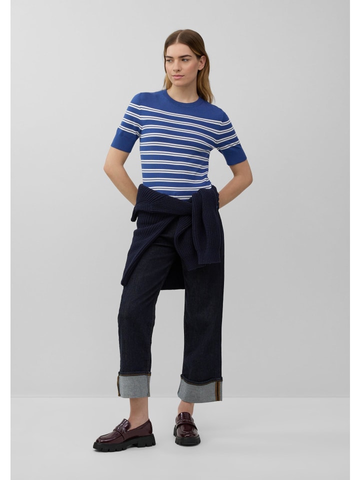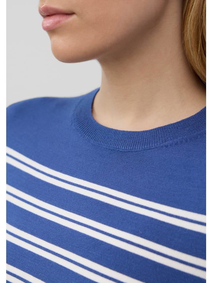 Этот полосатый свитер тонкой вязки с круглым вырезом сочетает в себе комфорт и стиль. Мягкая вискозная смесь и эластичный классический крой делают его идеальным дополнением к непринужденным повседневным образам.
