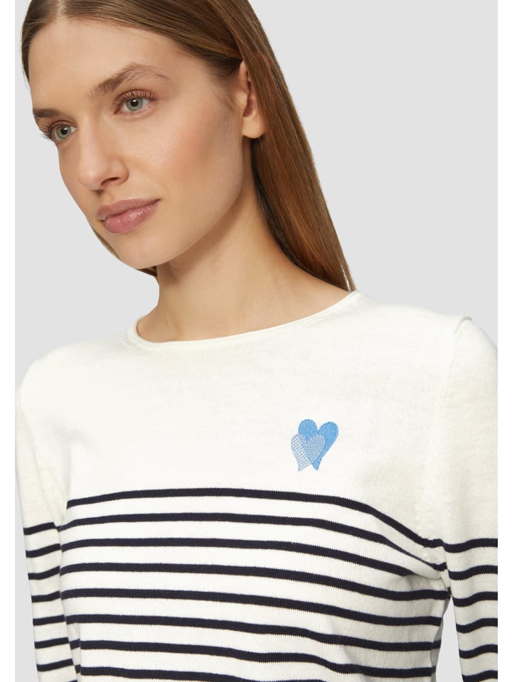 Этот уютный вязаный свитер с милой вышивкой в виде сердечек вызовет улыбку на вашем лице. Мягкие полоски и согревающий классический крой делают его идеальным дополнением к расслабленным, повседневным образам.