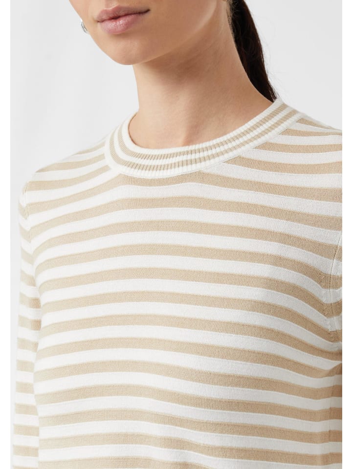 Элегантная изысканность на каждый день: этот приталенный полосатый свитер тонкой вязки сочетает в себе комфорт и стиль. Трикотажный воротник и ребристые манжеты придают дизайну классический вид. Благодаря мягкой эластичной текстуре и облегающему крою он удобно облегает фигуру. Полоски добавляют модный акцент - идеально подходят для элегантного повседневного образа.