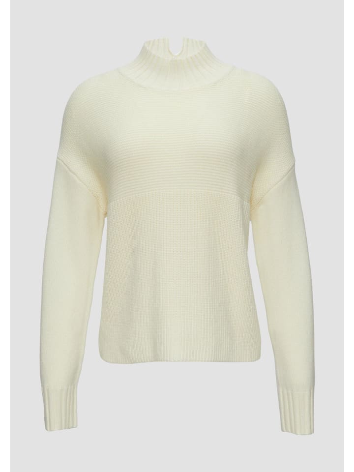 Уютный трикотажный свитер с изысканным сочетанием текстур и теплым воротником-стойкой. Мягкая вязка в рубчик, спущенная линия плеча и эластичные манжеты обеспечивают комфорт и непринужденную посадку - идеально для уютных повседневных образов.
