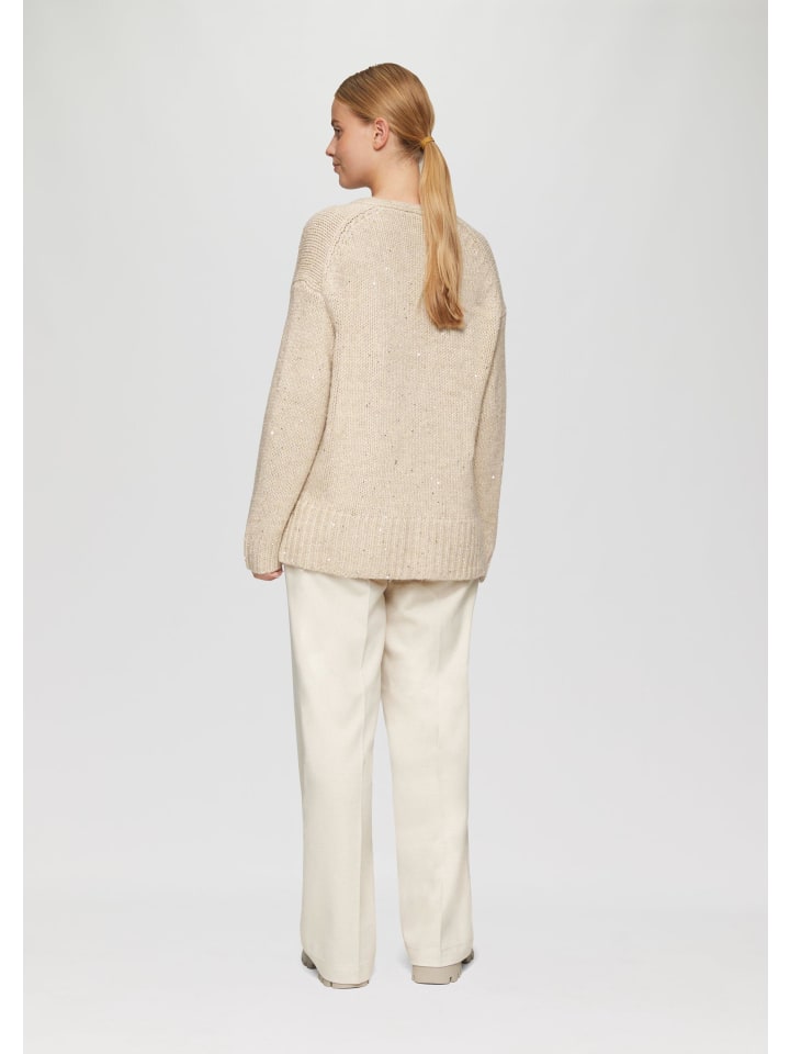 Этот уютный свободный трикотажный свитер очаровывает сверкающей блестящей пряжей и мерцающими пайетками. V-образный вырез и боковые разрезы придают мягкому свитеру женственность - он идеально подходит как для повседневного ношения, так и для торжественных случаев.
