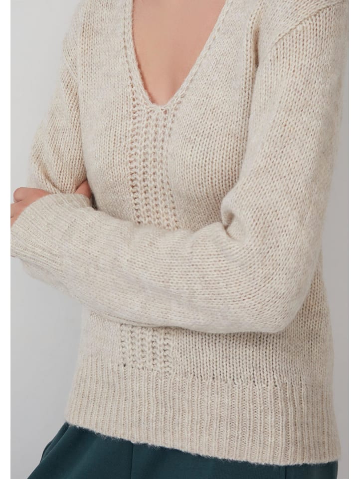 Уютный свитер из смеси альпаки с характерным узором вязки и V-образным вырезом. Мягкий трикотаж с теплой подкладкой комфортно облегает тело благодаря свободному крою и эластичным манжетам в рубчик. Идеально подходит для создания непринужденных, повседневных образов.